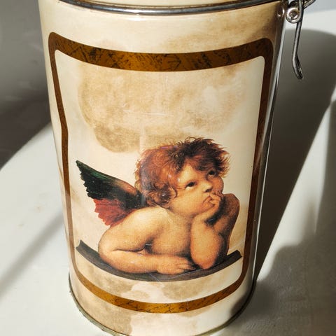 Burk med motiv av Paris i rosa toner. Illustrationen föreställer en person som går med shoppingkassar och en hund framför Eiffeltornet.