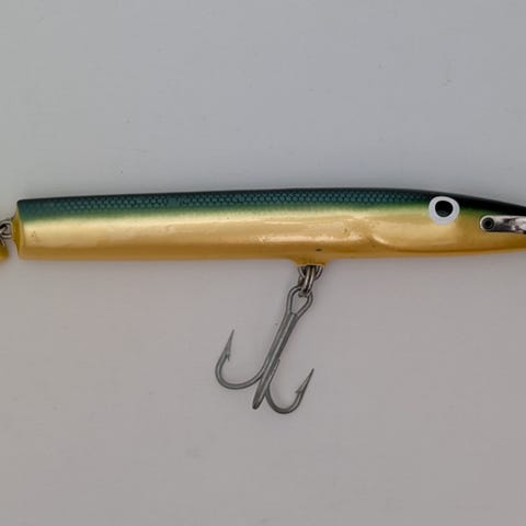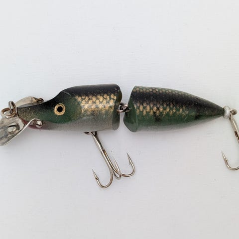Säljer en klassisk ledad vintage-wobbler i det populära färgmönstret "Red Head". Draget är tillverkat i formgjuten plast och fronten är utrustad med en rejäl metallsked stämplad med "JET", vilket tyder på att det är en äldre modell från 1960- eller 70-talet. Ett trevligt och tidstypiskt bete med fin patina som fungerar utmärkt för retro-fisket efter gädda eller som dekoration i samlingen.