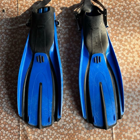 Ett fäste är trasigt, men det går att fästa remmen direkt i simfoten.