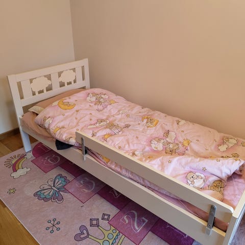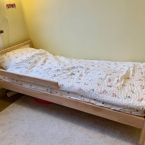 IKEA juniorsäng i trä. Passar barn som vuxit ur spjälsäng men ännu inte behöver fullstor säng. Sängen har låg höjd anpassad för barn och är lämplig för standardmadrass i juniorstorlek. Enkel, rak design som fungerar i de flesta barnrum. Madrass ingår.
