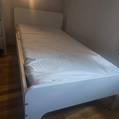 IKEA spjälsäng i vit färg. Sängen har ribbor på sidorna och en hög gavel i båda ändar. Under sängen finns en utdragbar förvaringslåda som kan användas för förvaring av exempelvis sängkläder eller leksaker. Passar för små barn/baby. Madrass, kudde och övriga textilier på bilderna kan ingå eller uteslutas enligt överenskommelse.