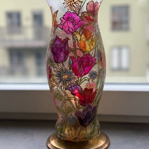 Jättesöt vintage glasvas på metallfot, murgröna