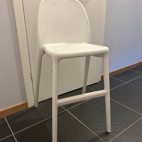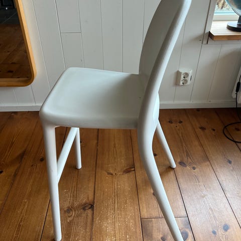 IKEA barnstol i vit plast. Stol med ryggstöd och fyra ben, anpassad för barn. Passar till matbord, pysselhörna eller lekrum. Lätt att torka av och flytta vid behov. 400kr nypris