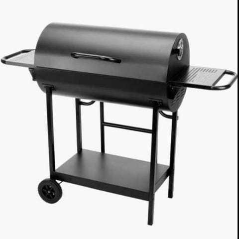 Grillen har lock med termometer och gott om arbetsyta bredvid för att förbereda mat. Hyllorna under ger bra plats för grilltillbehör, kol eller redskap.