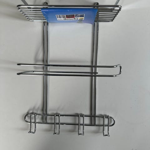 DuoBad dusch korg rostfritt i krom för montering i dusch eller badrum. Rektangulär modell med ribbor i metall som låter vatten rinna igenom. Levereras med skruvar och pluggar för väggmontering enligt förpackningens anvisningar. Lämplig för förvaring av schampo, tvål och andra duschprodukter.