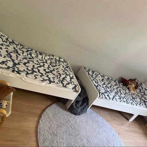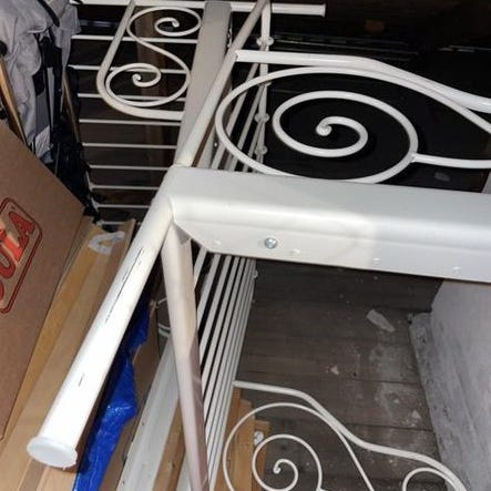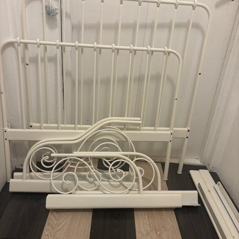 Vit säng som kan justera längden på, med ribbor till botten, 80 cm bred, ingen madrass med i köpet.