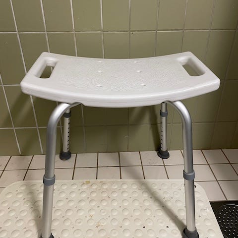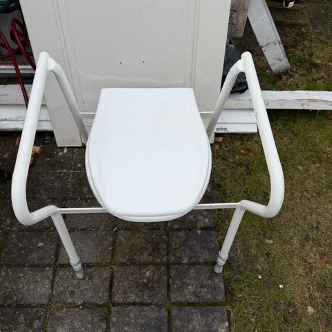 Vit duschpall och toalettstol med metallstativ och plast- eller komposititsar. Toalettstolen har utskuren sits framtill för enklare hygien och armstöd för stöd vid förflyttning. Duschpallen har rund sits med dräneringshål och fyra ben. Båda möblerna är avsedda för användning i badrumsmiljö, exempelvis i dusch eller vid toalettbesök, och ger stabil sittplats vid nedsatt rörlighet eller behov av extra stöd.