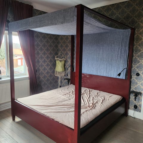 Himmelssäng Säng i trä. Mått: 190 cm bred, 199 cm hög, 222 cm lång. Mkt stadig . Rymmer två sängbottnar och med en bäddmadrass blir den perfekt. Möjlighet att placera fyra stycken stora förvaringslådor samt tre mindre på kortändan . 21 cm höjd under sängen