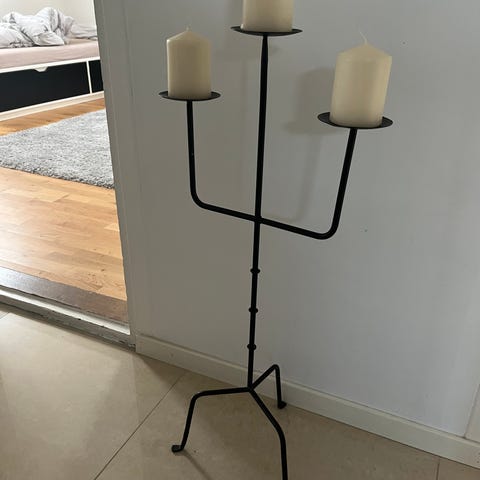Ljusstake i svart metall med plats för fem stearinljus. Modellen har flera armar i olika höjd och en stabil fot med fyra ben. Passar för användning på bord, bänk eller fönsterbräda som belysning eller dekoration i hemmet.