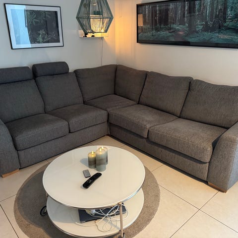 Soffan är i mörkgrå tyg (slitstarkt), bekväm med fluffiga kuddar och bra sittdjup. Funkar både som vardagssoffa och gästbädd.