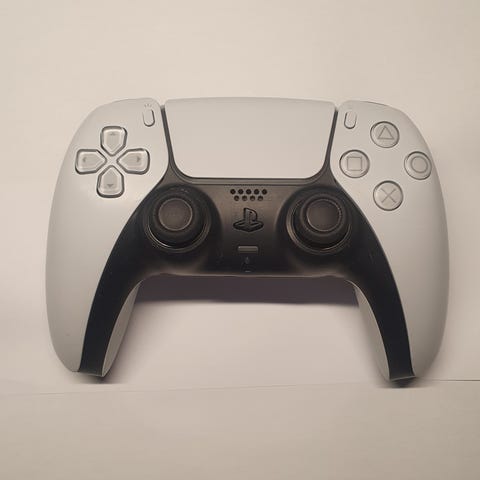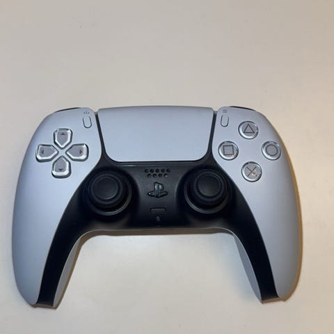 Sony Playstation 5 handkontroll i vit och svart färg. Trådlös spelkontroll avsedd för Playstation 5-konsol, med inbyggda styrspakar, styrkors, knappar och pekplatta. Passar för spelande på Playstation 5 och kompatibla enheter som stödjer denna typ av handkontroll.
