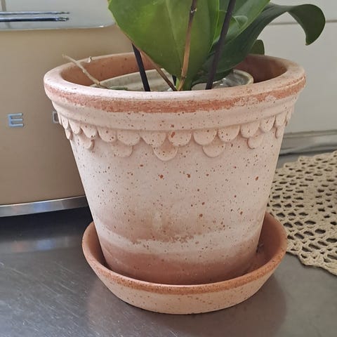 Bergs kruka med fat i glaserad keramik. Diameter ca 18 cm enligt märkning under krukan. Färg i gul/ockra ton. Tillverkad i Italien. Passar för inomhusväxter eller mindre utomhusplanteringar, med tillhörande fat för uppsamling av överflödigt vatten.