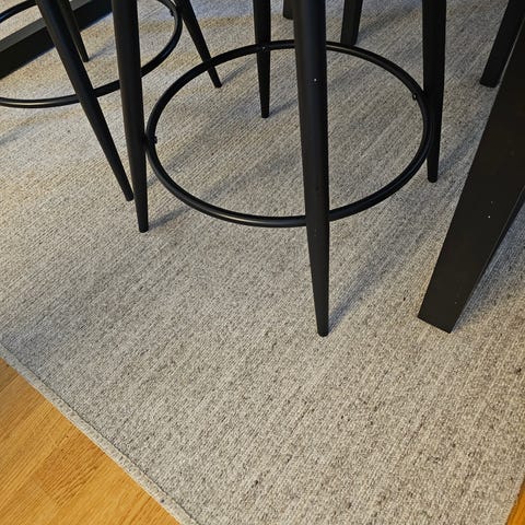 IKEA matta i två färger, grå och vit. Passar som golvmatta i exempelvis vardagsrum, kök eller hall. Enkel, rektangulär design som fungerar som underlag för bord eller annan inredning.