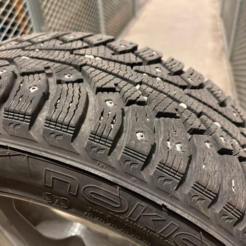 Fyra fälgar med monterade dubbade vinterdäck. Fälgarna är lättmetallfälg i silver. Däckmönstret är anpassat för vinterväglag med dubbar för bättre grepp på is och snö. Passar bil med samma bultmönster och dimensioner som fälgen och däcket är avsedda för. Tex Opel Grandland.