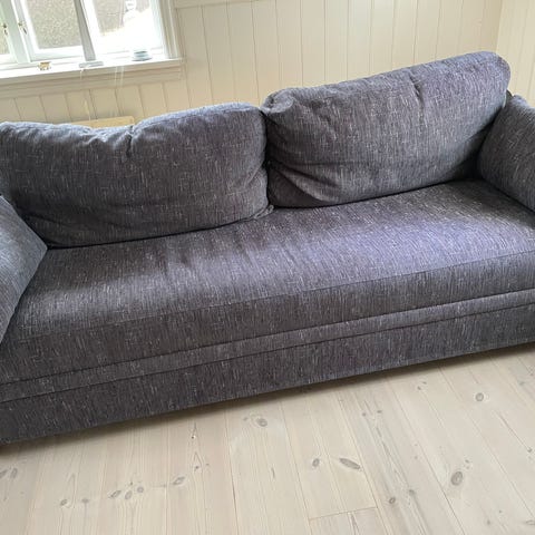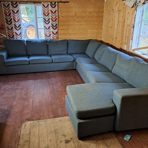Hörnsoffa med fotpall. Fopallen är 65x65 cm. Den raka delen på soffan är 2,67, hörndelen mäter 1,10 m. Sitthöjd 42 cm. Soffan är köpt hos Santa Fe. Soffan finns på Skaftö.