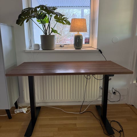 Säljer mitt elektriska höj- och sänkbara skrivbord i fint skick. Bordsskivan är i vacker valnötslook med ett varmt och exklusivt utseende som passar in i de flesta hem och kontor. Stativet är i svart metall och ger bordet en stilren och modern känsla. Litet märke. i Hämtas i Kungsholmen.
