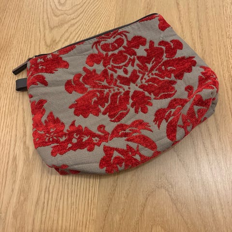 This bag is a Polish folk-style clutch bag featuring a traditional red floral "Highlander" pattern.