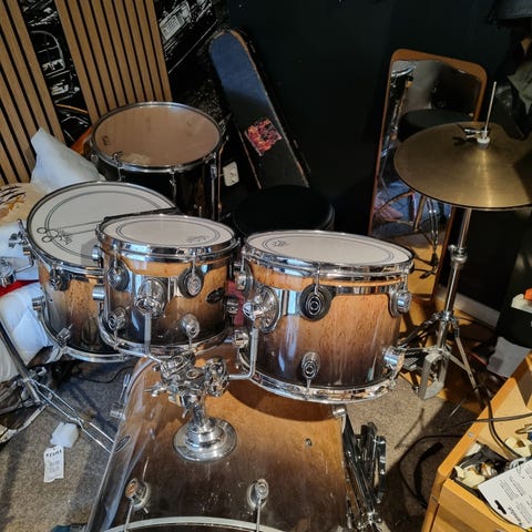 Power Craft trumset i röd färg. Setet består av bastrumma, virveltrumma, flera pukor samt cymbaler monterade på stativ. Trumsetet är avsett för inomhusbruk och passar för övning och spel i hemmet eller replokal. Sits/pall och notställ ingår. Trummorna är lackerade i rött med metallbeslag och är uppställda på golv med justerbara stativ. 4 st trumpinnar ingår också .