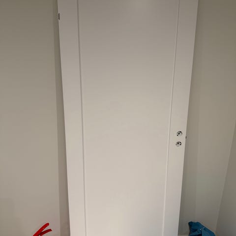 2 st innerdörrar Swedoor Unique 01L färg vit 0502-Y. Modulmått 80x200 cm. Bredd dörrblad 72,5 cm och höjd 194 cm. Tjocklek 40 cm. Massivt trä i konstruktionen som gör dörren gedigen och tung. Snap- in gångjärn modell efter 1972.