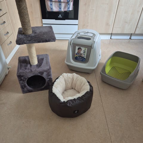 Kattlåda med flera kg kattsand ingår också.