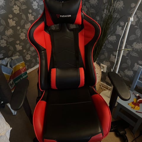 Säljer en oöppnad gamingstol den på bilden är en likadan har en oöppnad. Stolen har nackstöd ben stöd och ryggstöd och kan luta sig 155 grader bakåt.