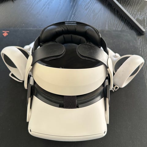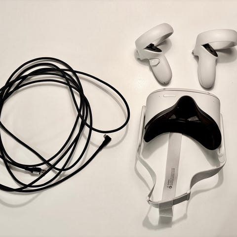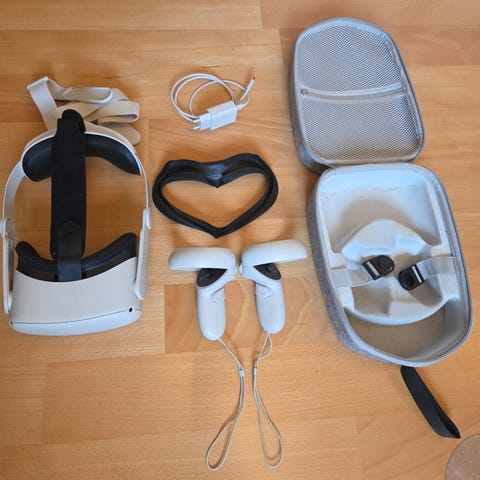 Oculus Quest 2 VR-headset med två trådlösa kontroller. Headsetet är vitt och har justerbara remmar för huvudpassform. Inga skador eller skavanker, allt funkar fint. Ca 3-4 år gammalt, men rätt lite använt. Finns i Enskededalen, kan skickas