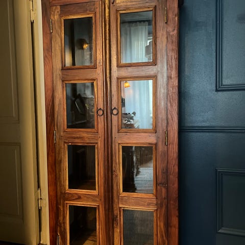 Skåpet har en dekorativ front med ovalt mönster och en dörr med metallhandtag. Passar som förvaring i exempelvis vardagsrum, hall eller sovrum för textilier, porslin eller andra hushållssaker.