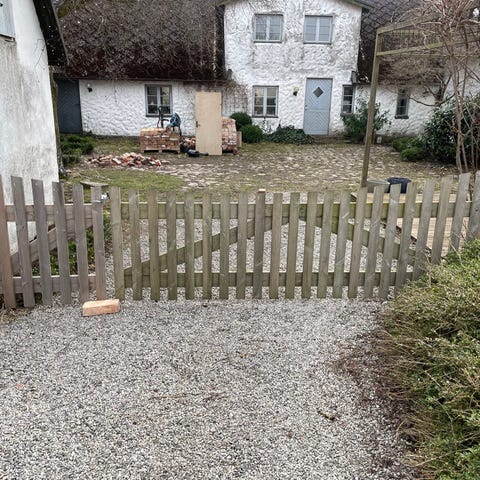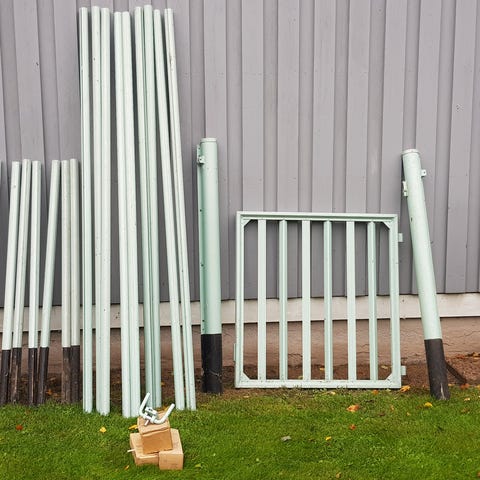 Trägrind i gråmålat trä/ impregnerat. (de två längst till höger). Består av 2 st grindhalvor. Monteras mot stolpar eller annan stabil konstruktion. Stolpar ingår ej. Säljs i befintligt skick.