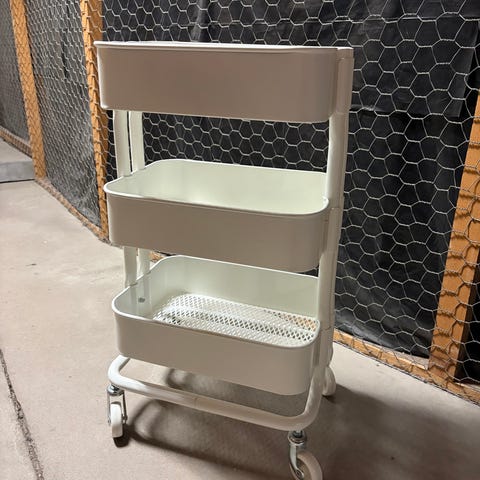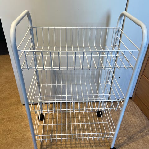 Rullvagn i vitlackerad metall med tre hyllor från IKEA.