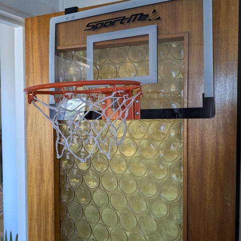 Basketkorg med transparent planka och röd markerad ram. Korgen är rund med nät i vitt och rött. Konstruktionen är avsedd för montering på dörr eller räcke, inomhus el utomhus. Passar för mindre boll.