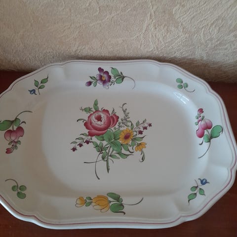 Uppläggningsfat 1 stort 1 lite mindre 1 litet 1 potatisskål 1 såskål allt för 95 kr med små blommor som dekoration har blivit lite blekta med åldern felfria finns I Linköping kan skickas köparen betalar frakten