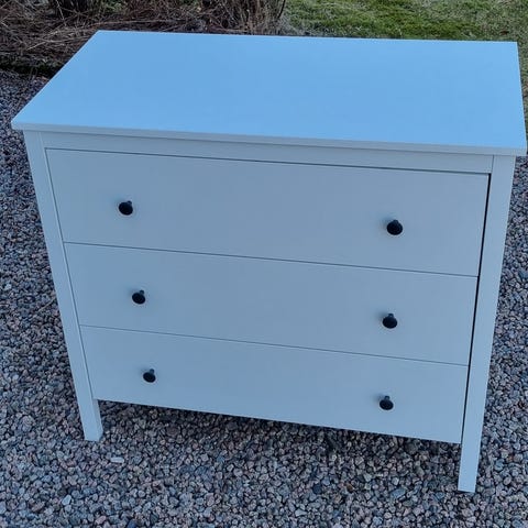 Hemnes byrå med tre lådor från Ikea. Nypris på Ikea 2 495 kr. Perfekt att måla om till egen färg eftersom lite färg skavts av.