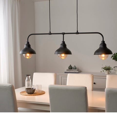 Lampan hängs upp i två kedjor som fästs i ett avlångt takfäste. Konstruktionen är i mörk metall med en ram runtom och transparenta glassidor. Passar exempelvis över matbord eller köksö. Ljuskällor E27 med varmt ljus ingår.