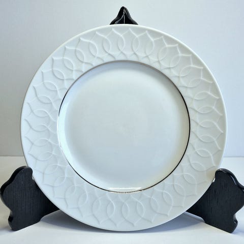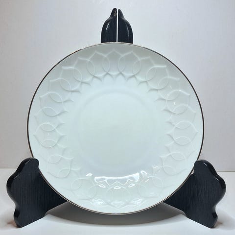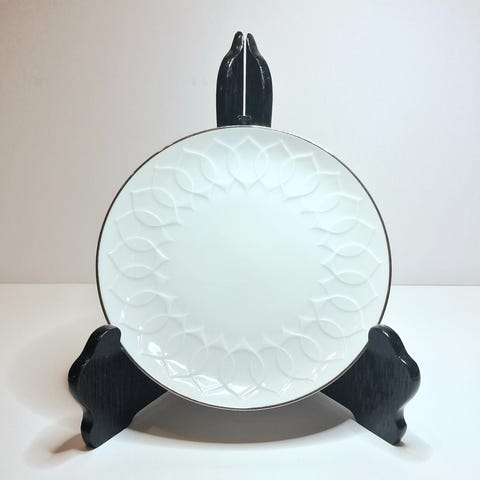 Vitt porslinsfat med karakteristisk relief dekoration av präglade Lotusblad med en tunn kantlinje i silver. Porslinsservis i högsta kvalitet.
