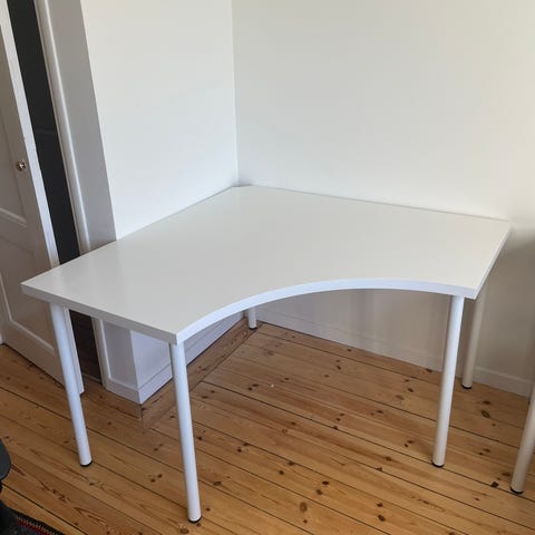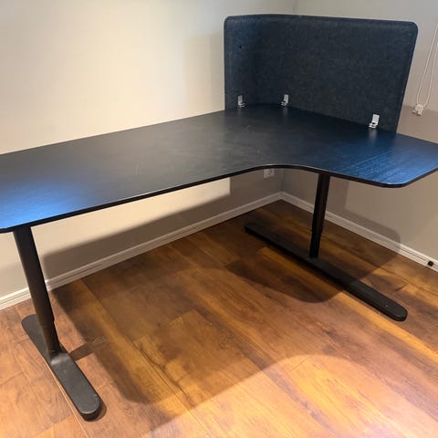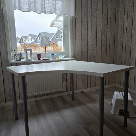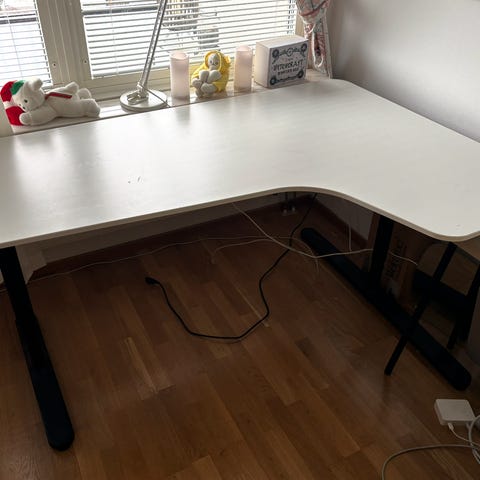Säljer vårt hörnskrivbord IKEA BEKANT enligt bild, vit bänkskiva och svarta ben (160x110 cm). Slitstark melaminyta samt ett inbyggt nät under bordsskivan för smart kabelhantering.