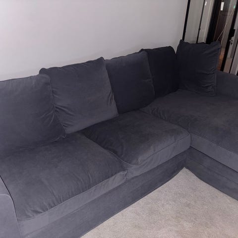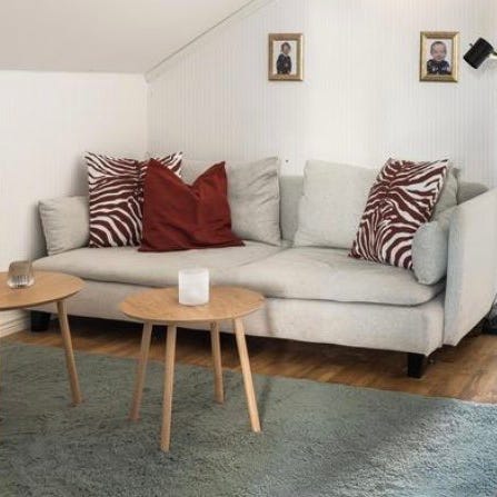 • Hundskada: Vår hund har bitit hål i klädseln på undersidan/hörnen av sittkuddarna (se detaljbilder). Skadan sitter endast i själva tyget och påverkar inte sittupplevelsen eller soffans form. När kuddarna ligger på plats syns skadan inte alls.
