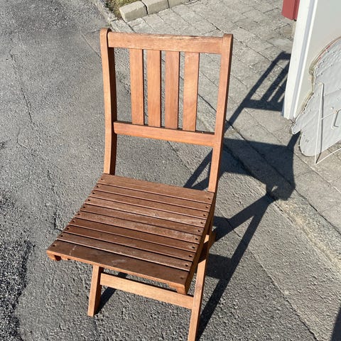 Hopfällbara trästolar i brunt trä. Stolarna har ribbad sits och ryggstöd med tre vertikala ribbor. Passar exempelvis i kök, hall, balkong eller uteplats där det finns behov av extra sittplatser som enkelt kan fällas ihop och ställas undan när de inte används.