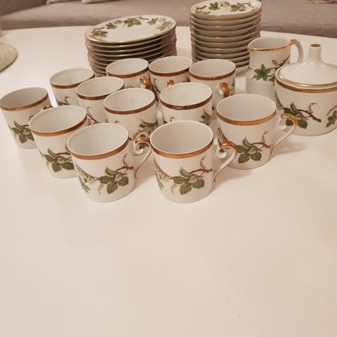 Hackefors porslinservis VINRANKA med dekor av gröna blad och guldfärgade kanter. Servisen består av koppar med fat samt fyrkantiga assietter/tallrikar i matchande dekorer.
