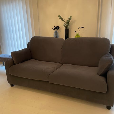 Soffa längd 210 centimeter och bredd 90 centimeter.