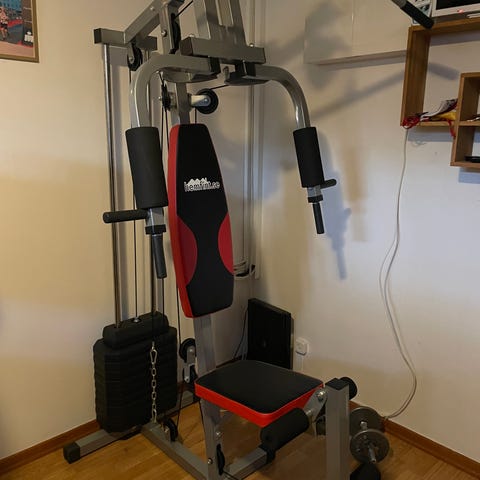 Abilica multigym i svart utförande. Maskinen har viktmagasin med flera viktskivor och vajersystem för olika styrkeövningar. Utrustad med sittdyna, ryggstöd och armstöd med vadderade kuddar. Möjlighet till bland annat bröstpress, latsdrag, bencurl och andra basövningar för styrketräning i hemmet. Passar för inomhusbruk i hemmagym eller träningsrum.