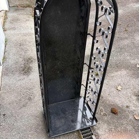 Okänd tillverkare vattenbehållare till vedspis i avlång rektangulär form med tappkran på ena kortsidan. Behållaren är kopparfärgad med plan ovansida och en nedsänkt del i ena änden. Den står på en fristående svart metallställning med dekorativa cirkelformade detaljer. Lämplig som dekorativ inredningsdetalj eller för förvaring av vatten eller andra vätskor efter behov. Exakta mått och volym är inte angivna.