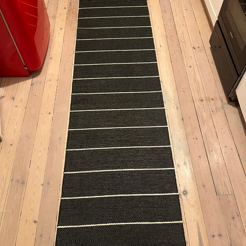 Pappelina Ella plastmatta, en gångmatta med grafiskt mönster i svart och vitt. Denna längd tror jag inte finns att köpa ny.