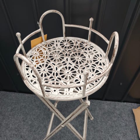 Runt utebord i metall med perforerad bordsskiva. Bordet har en ljus gröngrå färg och står på ett korsat underrede i metall. Passar som sidobord eller mindre matbord på altan, balkong eller uteplats.