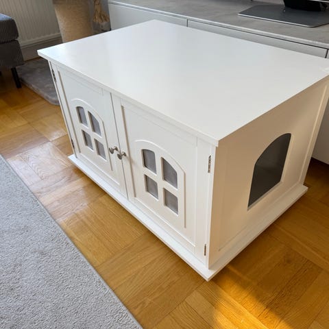 Säljer ett snyggt och praktiskt kattlådeskåp som gömmer kattlådan och samtidigt fungerar som en stilren möbel i hemmet. Perfekt om du vill slippa synlig kattlåda och minska skräp på golvet. Döljer kattlådan snyggt i hemmet, minskar lukt och spridning utav kattsand.