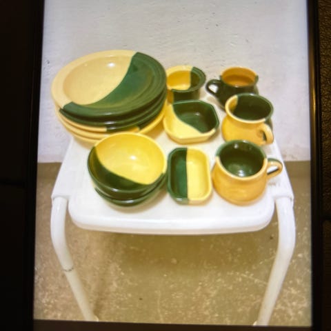 Made in Portugal, tallrik i grön keramik. Tallriken har ett bladliknande reliefmönster på ovansidan. Kallas även Kålblad (Cabbage leaf)
