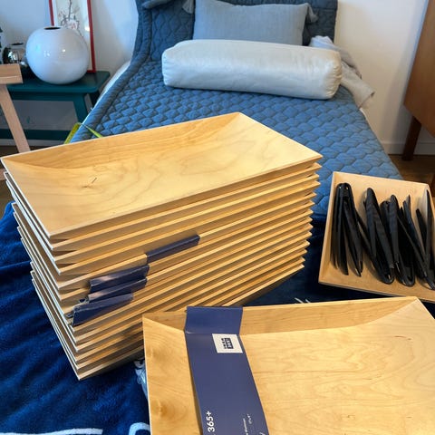 Allt har använts vid ett tillfälle: 30 mattallrikar, 30 mindre assietter, 29 champagneglas SVALKA, 12 vinglas STORSINT, 12 vinglas annan sort samt 13 vaser (6 lila och 7 ljusblå) från Åhléns.