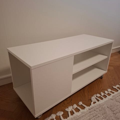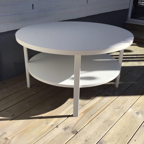 Runt soffbord från Jysk. Bordet är i mycket bra skick, och har alltid använts med en bordsduk över för skydd (skickar med bordsduken). Men tyvärr så har det ändå lyckats bli ett par märken på bordsskivan (går att se på bild).