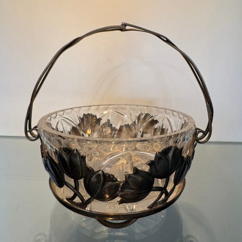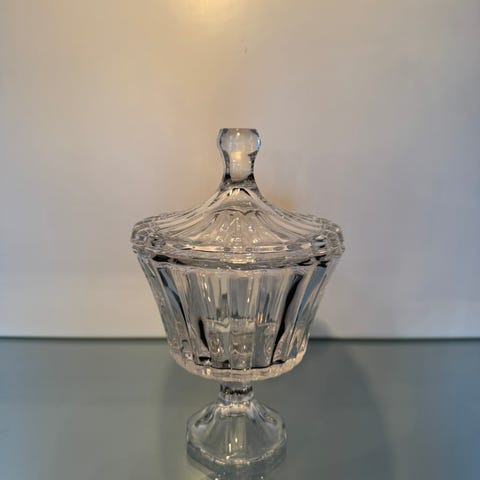 Kristallskål med lock på fot i klart glas. Skålen har slipat mönster runtom och en dekorativ knopp på locket. Höjden framgår av måttbandet på bilden och diametern är ungefär som visas på bilden ovanifrån. Passar till servering eller förvaring av exempelvis godis, frukt eller andra mindre föremål. Skålen kan även användas utan lock som serveringsskål på fot.