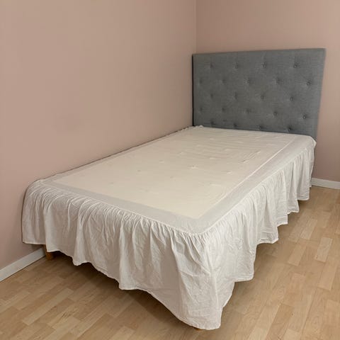 Kontinentalsäng med tillhörande bäddmadrass och sänggavel från Mio. Storlek 120x200 cm.