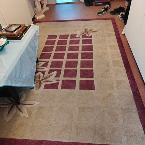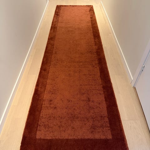 Handknuten matta i ull från Knut Mattor. Inköpt 2020. Vi designade mattan själva i samråd med Knut Mattor som sedan tillverkade mattan.